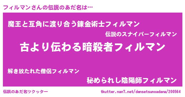 | 男性向けラノベタイトル風あだ名 | 『フィルマンに滅ぼされるだけの簡単なお仕事です』 |