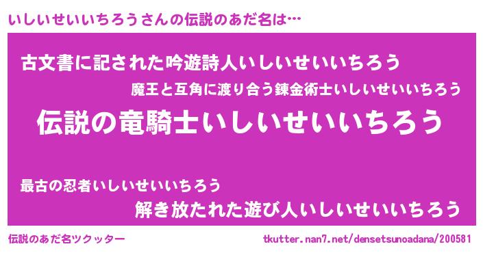 | 男性向けラノベタイトル風あだ名 | 『魔弾の王といしいせいいちろう』 |