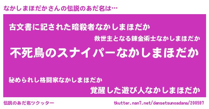 | 意味不明あだ名 | 『住所不定無職なかしまほだか(77歳)』 |