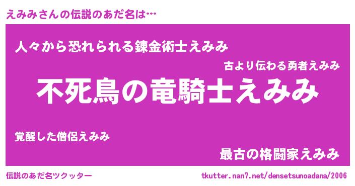 | 男性向けラノベタイトル風あだ名 | 『魔弾の王とえみみ』『えみみの憂鬱』 |