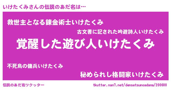 | 意味不明あだ名 | 『住所不定無職いけたくみ(95歳)』 |