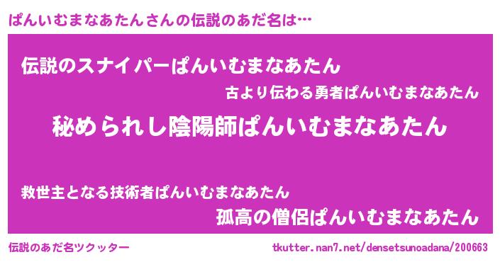 | 男性向けラノベタイトル風あだ名 | 『やはりぱんいむまなあたんの青春ラブコメはまちがっている 』 |