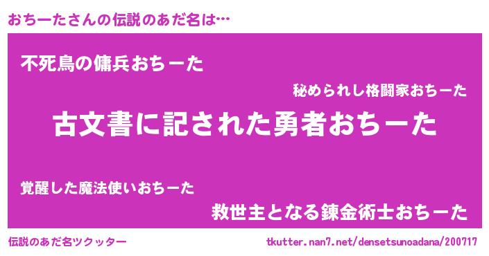 | 男性向けラノベタイトル風あだ名 | 『おちーたに滅ぼされるだけの簡単なお仕事です』 |