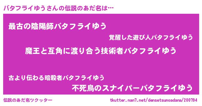 | 意味不明あだ名 | 『住所不定無職バタフライゆう(4歳)』 |