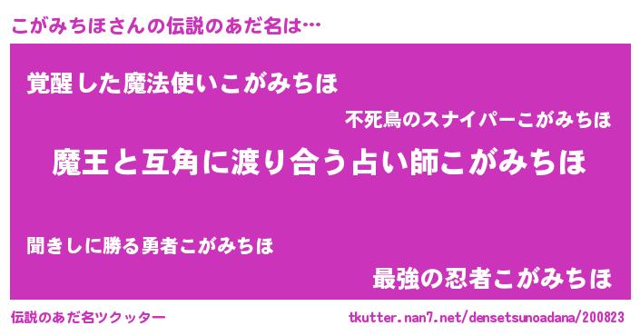 | 男性向けラノベタイトル風あだ名 | 『おまえをオタクにしてやるから、俺をこがみちほにしてくれ! 』 |