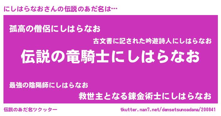 | 胡散臭い通販商品みたいなあだ名 | 『必ず成功するブレスレット…その名も「にしはらなお」』 |