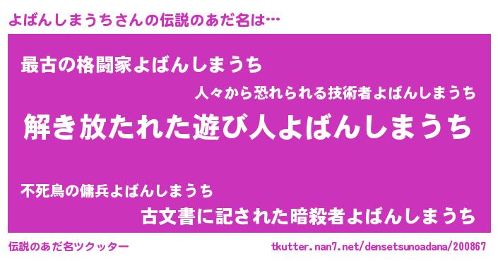 | 意味不明あだ名 | 『自称よばんしまうち』 |