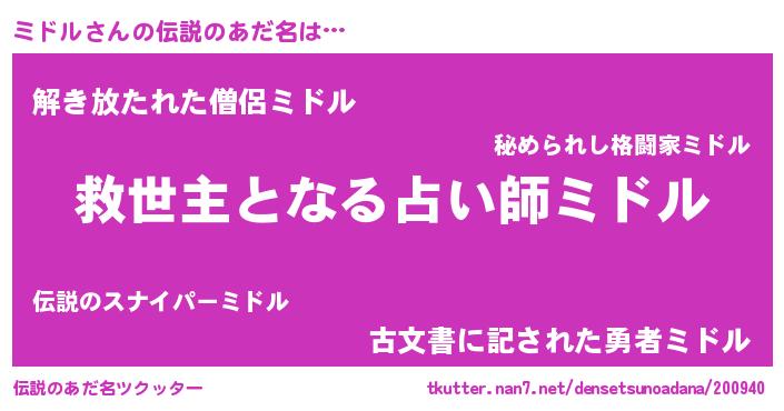 | ヒーロー風カッコイイあだ名 | 『慈愛の使者ミドル』『魔戒騎士ミド』 |