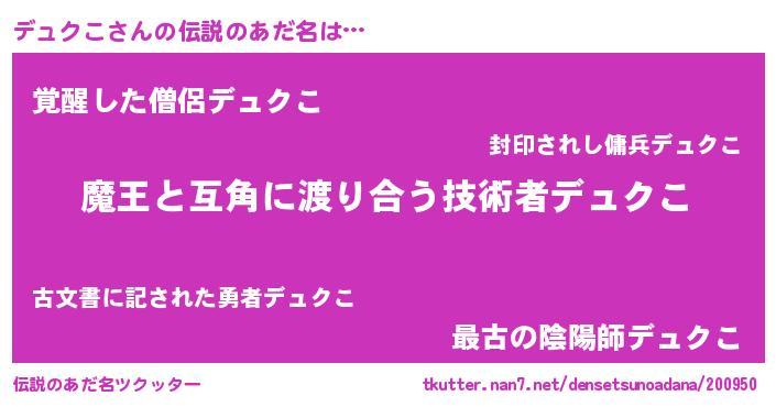 | 意味不明あだ名 | 『住所不定無職デュクこ(2歳)』 |