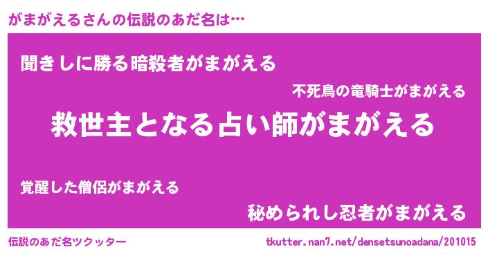 | ヒーロー風カッコイイあだ名 | 『慈愛の使者がまがえる』『仮面ガマダー』 |