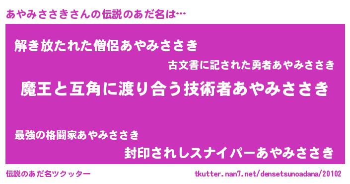| ヒーロー風カッコイイあだ名 | 『慈愛の使者あやみささき』 |