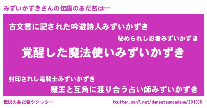 | ヒーロー風カッコイイあだ名 | 『仮面ミズダー』『最強戦士ミズイカズキ』 |