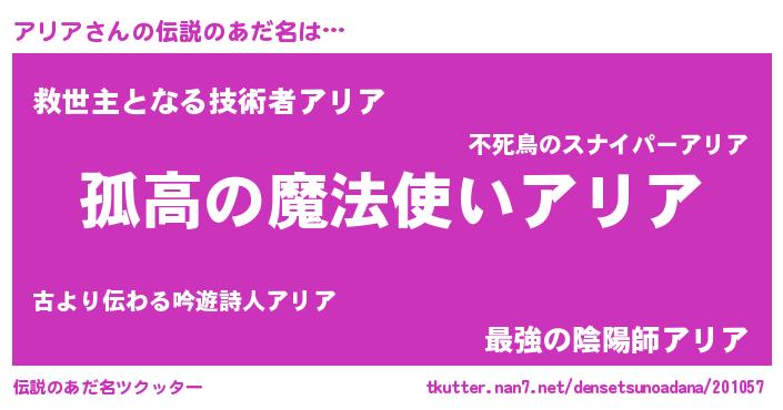 | 意味不明あだ名 | 『とにかく怪しいアリア』『自称アリア』 |