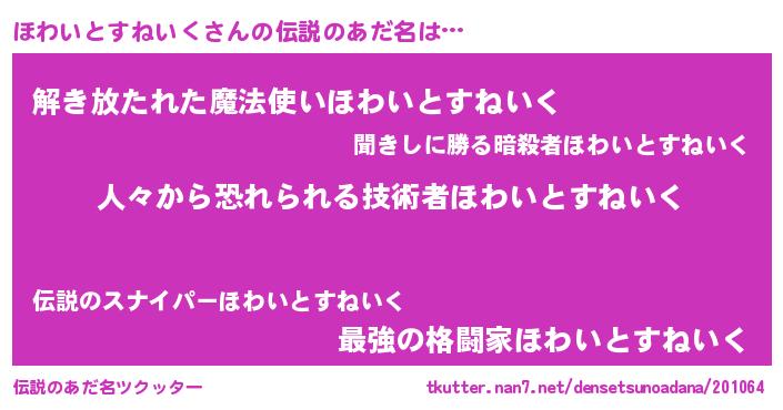 | 女子向けラノベタイトル風あだ名 | 『ほわいとすねいくなんてお断りですっ。』 |