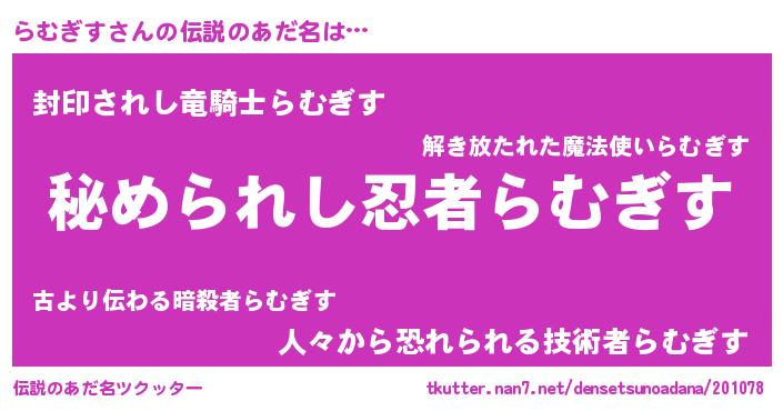 | 男性向けラノベタイトル風あだ名 | 『魔弾の王とらむぎす』『らむぎすの憂鬱』 |