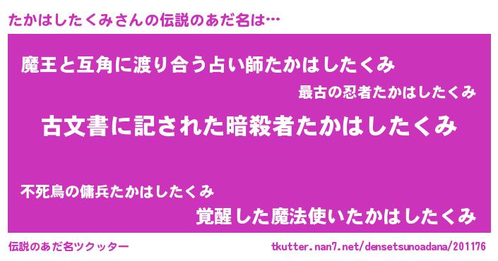 | 意味不明あだ名 | 『住所不定無職たかはしたくみ(40歳)』 |