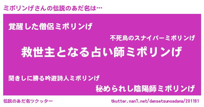 | 男性向けラノベタイトル風あだ名 | 『ミポリンげに滅ぼされるだけの簡単なお仕事です』 |