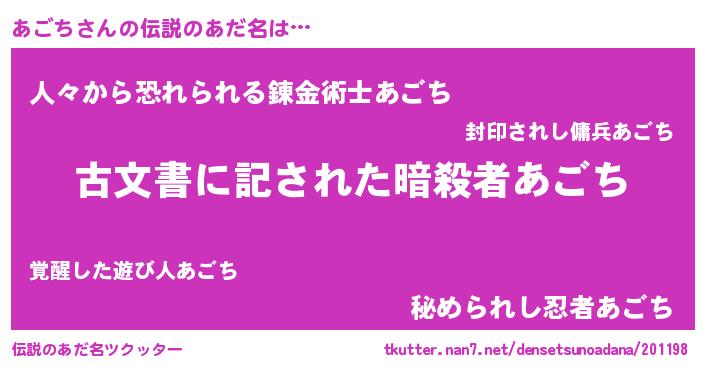 | 意味不明あだ名 | 『住所不定無職あごち(50歳)』『自称あごち』 |