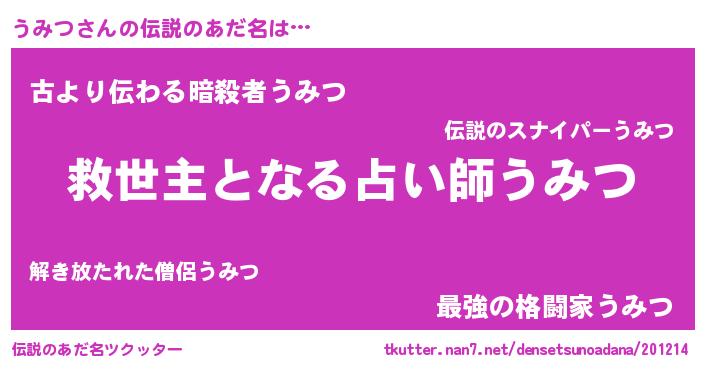 | 胡散臭い通販商品みたいなあだ名 | 『あなたにだけ特別に提供する限定10本のレアな日本酒…その名も「うみつ」』 |
