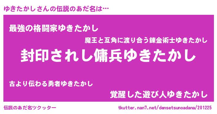 | 男性向けラノベタイトル風あだ名 | 『ユキタカシアートオンライン』 |