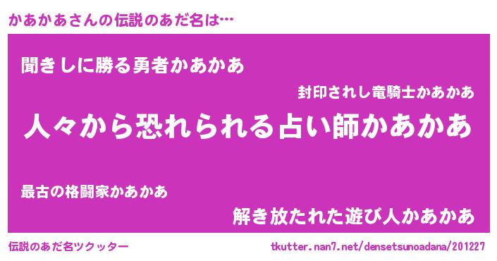 | ヒーロー風カッコイイあだ名 | 『仮面カアダー』『正義の使者かあかあ』 |