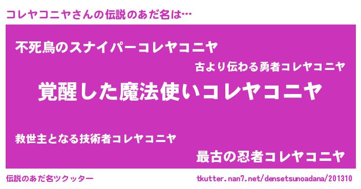 | 男性向けラノベタイトル風あだ名 | 『この素晴らしい世界にコレヤコニヤを!』 |
