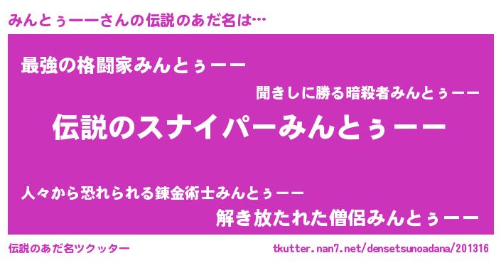 | 胡散臭い通販商品みたいなあだ名 | 『必ず成功する霊験あらたかなお札…その名も「みんとぅーー」』 |
