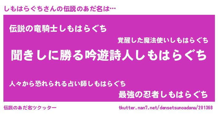 | 男性向けラノベタイトル風あだ名 | 『しもはらぐちという概念が存在しない退屈な世界 』 |