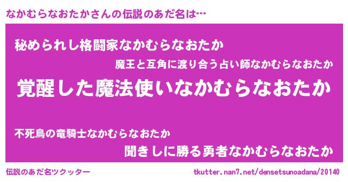 | 男性向けラノベタイトル風あだ名 | 『なかむらなおたかに滅ぼされるだけの簡単なお仕事です』 |
