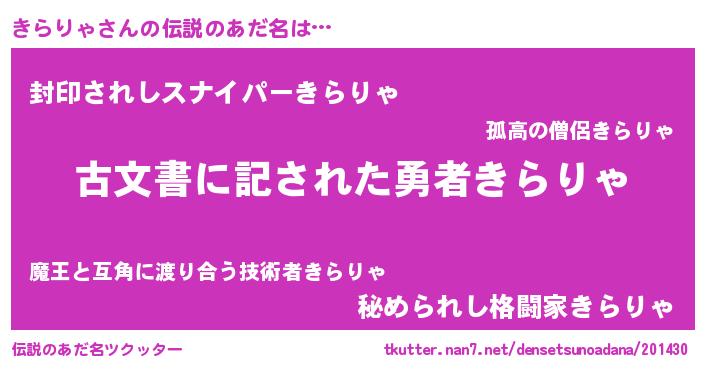 | ヒーロー風カッコイイあだ名 | 『ネオキラリャ』『スーパーキラリャ』 |