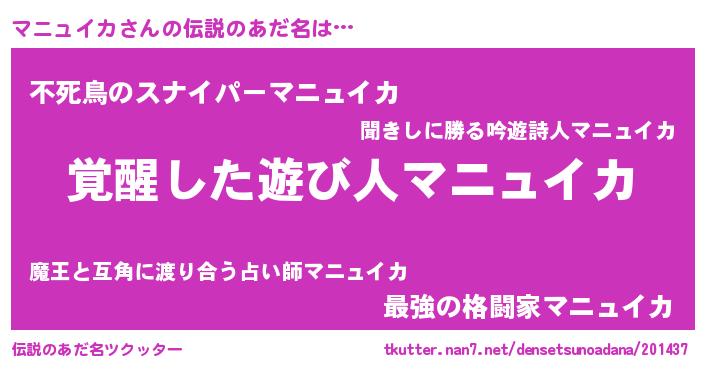 | 男性向けラノベタイトル風あだ名 | 『マニュイカの嫁は女の子じゃないと思った?』 |