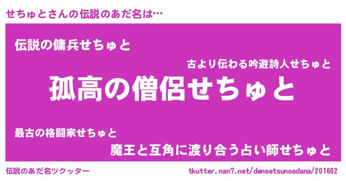 | 男性向けラノベタイトル風あだ名 | 『魔弾の王とせちゅと』『せちゅとの憂鬱』 |