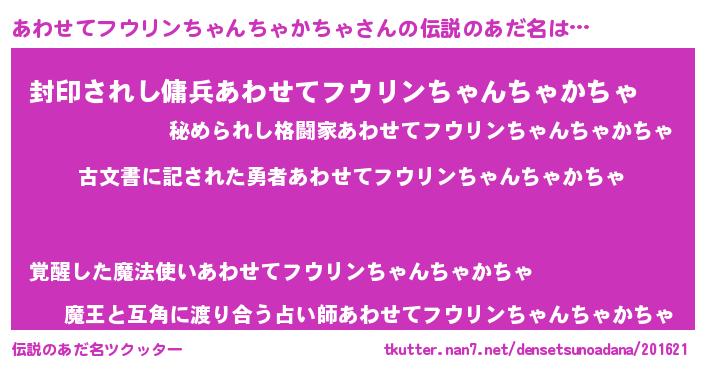 | 胡散臭い通販商品みたいなあだ名 | 『あなたにだけ特別に提供する世界で10本だけ現存している希少なブランデー…その名も「あわせてフウリンちゃんちゃかちゃ」』 |