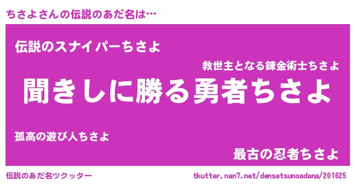 | 女子向けラノベタイトル風あだ名 | 『異世界で失敗しない100のちさよ』 |
