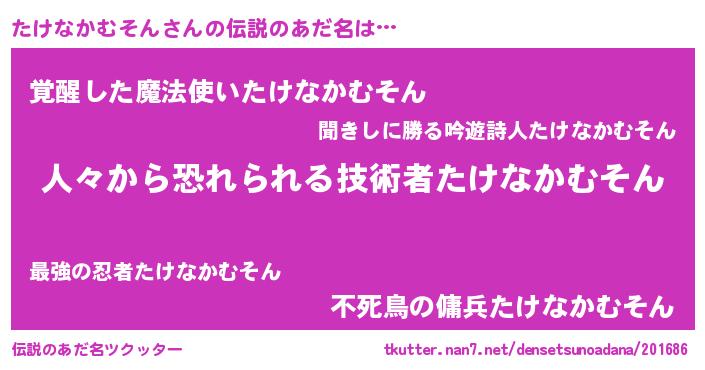 | 男性向けラノベタイトル風あだ名 | 『おまえをオタクにしてやるから、俺をたけなかむそんにしてくれ! 』 |
