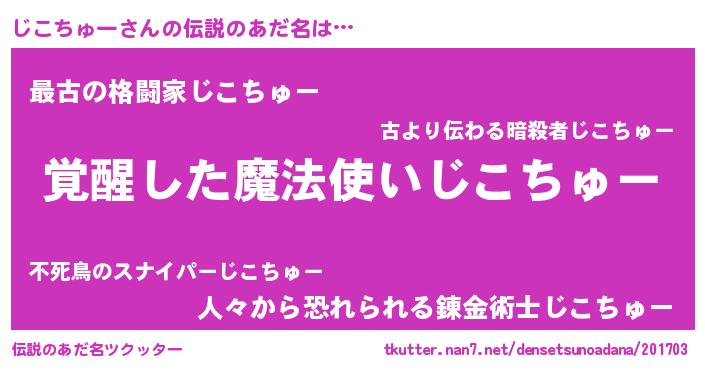 | ヒーロー風カッコイイあだ名 | 『炎刃騎士ジコ』『天空の使者じこちゅー』 |