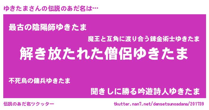 | 男性向けラノベタイトル風あだ名 | 『Re:ゆきたまから始める異世界生活』 |