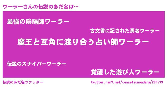 女子向けラノベタイトル風あだ名 | 『ワーラー恋絵巻』『ワーラーの婚約者』 |