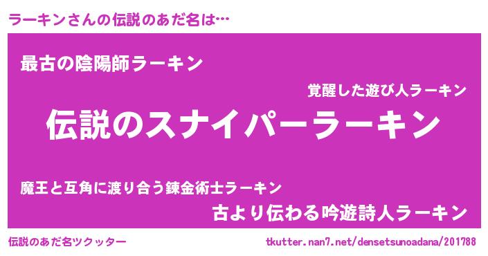 | 意味不明あだ名 | 『ペロリンラーキン』『自称ラーキン』 |