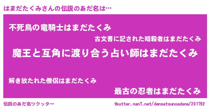 | 男性向けラノベタイトル風あだ名 | 『はまだたくみに滅ぼされるだけの簡単なお仕事です』 |