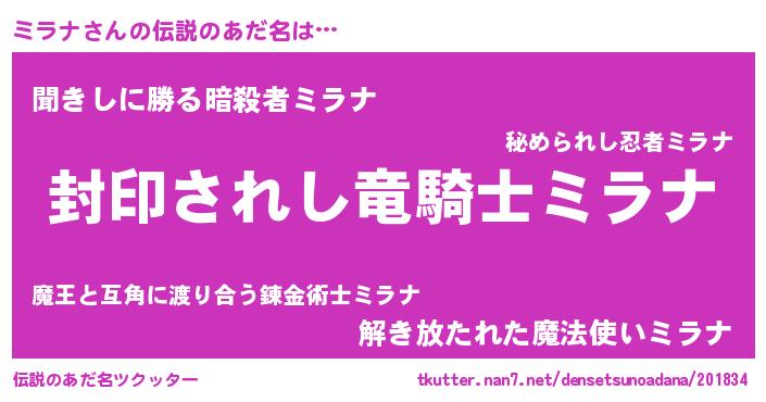 | 男性向けラノベタイトル風あだ名 | 『この素晴らしい世界にミラナを!』 |