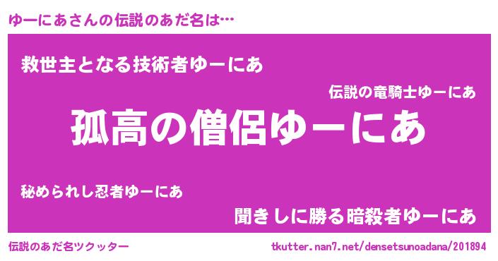 | 女子向けラノベタイトル風あだ名 | 『ゆーにあは平凡を望む』『闇のゆーにあ』 |