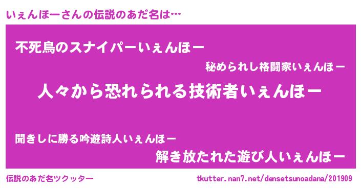 | 男性向けラノベタイトル風あだ名 | 『おまえをオタクにしてやるから、俺をいぇんほーにしてくれ! 』 |