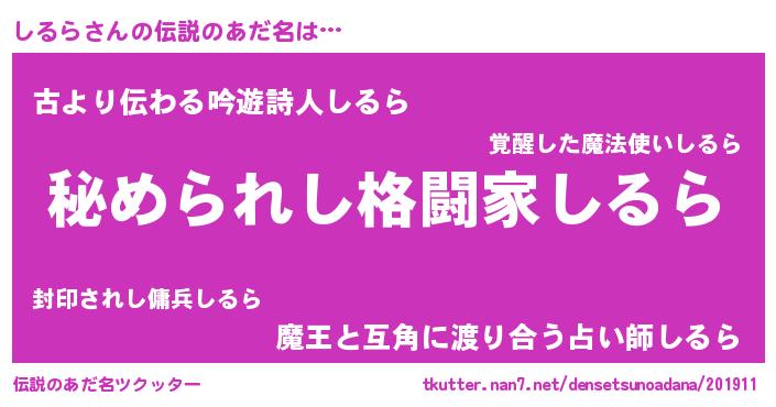 | ヒーロー風カッコイイあだ名 | 『仮面シルダー』『ウルトラしるらマン』 |