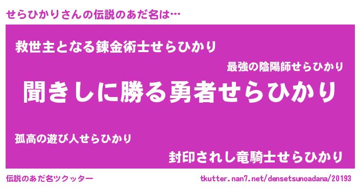 | 男性向けラノベタイトル風あだ名 | 『せらひかりという概念が存在しない退屈な世界 』 |