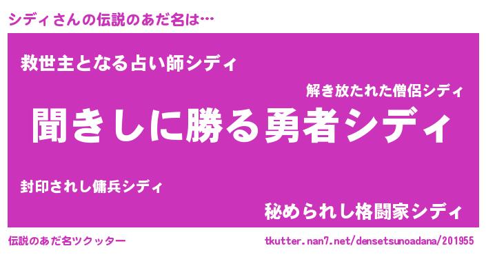 | 男性向けラノベタイトル風あだ名 | 『魔弾の王とシディ』 |