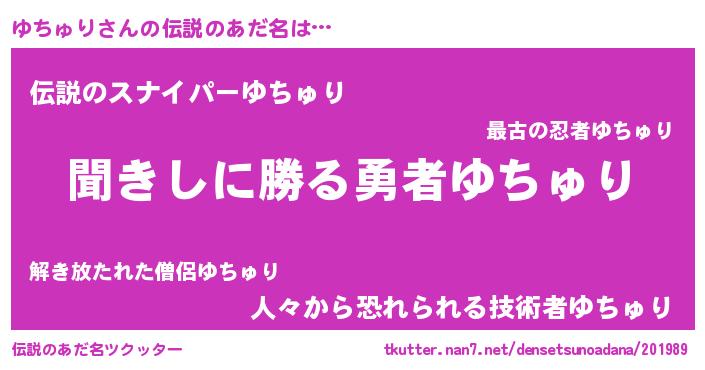 | 女子向けラノベタイトル風あだ名 | 『異世界で失敗しない100のゆちゅり』 |