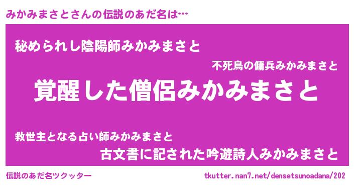 | 男性向けラノベタイトル風あだ名 | 『みかみまさと~年齢イコール彼女いない歴の魔法使い~』 |
