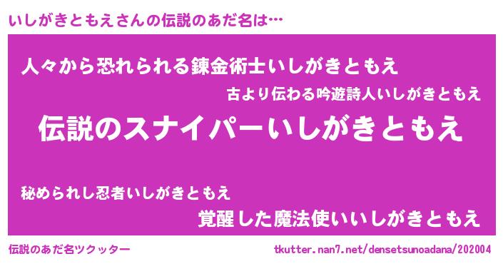 | 胡散臭い通販商品みたいなあだ名 | 『必ず成功する霊験あらたかなお札…その名も「いしがきともえ」』 |