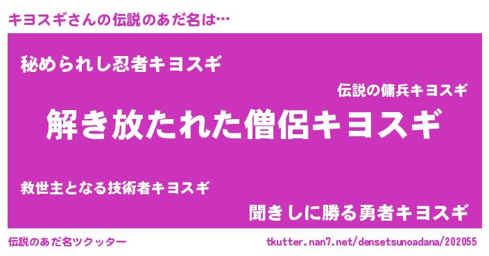 | 男性向けラノベタイトル風あだ名 | 『ダンジョンにキヨスギを求めるのは間違っているだろうか』 |